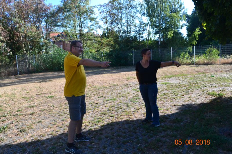 Für die Stadtverordneten Dr. Rüdiger Werner und Valeska Donners ist der Platz im Gleisdreieck hinter der Turnhalle der Trinkbornschule ideal, um hier einen Jugendtreffpunkt mit Basketballfeld zu errichten.